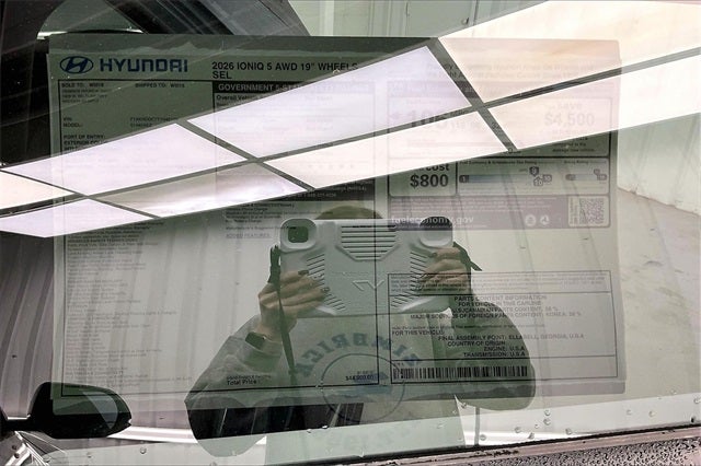 Digital Teal 2026 Hyundai IONIQ 5 SEL AWD 1-Speed Automatic Electric Motor 4-Wheel Disc Brakes, 6 Speakers, ABS brakes, Air Conditioning, Alloy wheels, AM/FM radio: SiriusXM, Apple CarPlay & Android Auto, Auto High-beam Headlights, Auto-dimming Rear-View mirror, Automatic temperature control, Bodyside moldings, Brake assist, Bumpers: body-color, Delay-off headlights, Driver door bin, Driver vanity mirror, Dual front impact airbags, Dual front side impact airbags, Electronic Stability Control, Emergency communication system: None, Four wheel independent suspension, Front anti-roll bar, Front Bucket Seats, Front Center Armrest w/Storage, Front dual zone A/C, Front reading lights, Fully automatic headlights, Garage door transmitter: HomeLink, H-Tex Artificial Leather Seating Surfaces, harman/kardon® Speakers, Heated door mirrors, Heated Front Bucket Seats, Heated front seats, Illuminated entry, Low tire pressure warning, Navigation System, Occupant sensing airbag, Option Group 01, Outside temperature display, Overhead airbag, Overhead console, Panic alarm, Passenger door bin, Passenger vanity mirror, Power door mirrors, Power driver seat, Power Liftgate, Power passenger seat, Power steering, Power windows, Radio: AM/FM/SiriusXM/HD Audio System, Rear anti-roll bar, Rear reading lights, Rear seat center armrest, Rear side impact airbag, Rear window defroster, Rear window wiper, Remote keyless entry, Security system, Speed control, Speed-sensing steering, Split folding rear seat, Spoiler, Steering wheel mounted audio controls, Telescoping steering wheel, Tilt steering wheel, Traction control, Trip computer, Turn signal indicator mirrors, Variably intermittent wipers, Wheels: 19 x 7.5J Alloy.