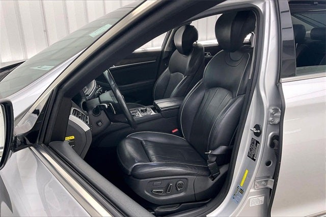 2017 Genesis G80 3.8 Santiago Silver Metallic 3.8L V6 DGI DOHC Dual CVVT 7 Color LCD Multi-Information Display, Front & Rear Parking Sensors, LED Fog Lamps, Option Group 02, Power Rear Window Sunshade, Power Tilt-and-Slide Panoramic Sunroof, Premium Package 02, Rearview Camera w/Parking Guidelines, 12-Way Power Heated Front Bucket Seats, 4-Wheel Disc Brakes, 7 Speakers, ABS brakes, Air Conditioning, Alloy wheels, AM/FM radio: SiriusXM, Android Auto & Apple CarPlay, Anti-whiplash front head restraints, Auto High-beam Headlights, Auto tilt-away steering wheel, Auto-dimming door mirrors, Auto-dimming Rear-View mirror, Automatic temperature control, Bodyside moldings, Brake assist, Bumpers: body-color, CD player, Compass, Delay-off headlights, Driver door bin, Driver vanity mirror, Dual front impact airbags, Dual front side impact airbags, Electronic Stability Control, Emergency communication system: Genesis Connected Services, Exterior Parking Camera Rear, Four wheel independent suspension, Front anti-roll bar, Front Bucket Seats, Front Center Armrest w/Storage, Front dual zone A/C, Front reading lights, Fully automatic headlights, Garage door transmitter: HomeLink, Heated door mirrors, Heated front seats, High intensity discharge headlights: Bi-Xenon, Illuminated entry, Knee airbag, Leather Seating Surfaces, Leather steering wheel, Low tire pressure warning, Memory seat, Navigation System, Occupant sensing airbag, Outside temperature display, Overhead airbag, Overhead console, Panic alarm, Passenger door bin, Passenger vanity mirror, Power door mirrors, Power driver seat, Power passenger seat, Power steering, Power windows, Radio: AM/FM/SiriusXM/HD/CD/MP3 Audio System, Rain sensing wipers, Rear anti-roll bar, Rear reading lights, Rear seat center armrest, Rear side impact airbag, Rear window defroster, Remote keyless entry, Security system, Speed control, Speed-sensing steering, Speed-Sensitive Wipers, Steering wheel memory, Steering wheel mounted audio controls, Tachometer, Telescoping steering wheel, Tilt steering wheel, Traction control, Trip computer, Turn signal indicator mirrors, Variably intermittent wipers, Wheels: 18 x 8.0J Alloy, Local Trade!, 7 Color LCD Multi-Information Display, Front & Rear Parking Sensors, LED Fog Lamps, Option Group 02, Power Rear Window Sunshade, Power Tilt-and-Slide Panoramic Sunroof, Premium Package 02, Rearview Camera w/Parking Guidelines.