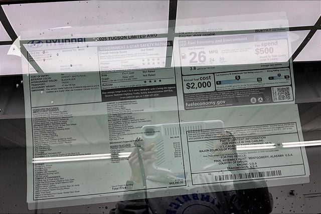 2025 Hyundai Tucson Limited White Pearl 2.5L I4 DGI DOHC 16V LEV3-SULEV30 187hp AWD 24/30 City/Highway MPG Hyundai Certified, AWD, 19 Alloy Wheels, 4-Wheel Disc Brakes, 8 Speakers, ABS brakes, Air Conditioning, All Season Fitted Liners, Alloy wheels, AM/FM radio: SiriusXM, Apple CarPlay & Android Auto, Auto High-beam Headlights, Auto-dimming Rear-View mirror, Automatic temperature control, Brake assist, Bumpers: body-color, Cargo Organizer, Cargo Tray, Delay-off headlights, Driver door bin, Driver vanity mirror, Dual front impact airbags, Dual front side impact airbags, Electronic Stability Control, Emergency communication system: Bluelink+, First Aid Kit, Four wheel independent suspension, Front anti-roll bar, Front Bucket Seats, Front Center Armrest, Front dual zone A/C, Front reading lights, Fully automatic headlights, Garage door transmitter: HomeLink, Heads-Up Display, Heated & Ventilated Front Bucket Seats, Heated door mirrors, Heated front seats, Heated rear seats, Heated steering wheel, Illuminated Door Sill Plates, Illuminated entry, Leather steering wheel, Leather-Trimmed Seat Trim, Low tire pressure warning, Memory seat, Navigation System, Occupant sensing airbag, Option Group 01, Outside temperature display, Overhead airbag, Overhead console, Panic alarm, Passenger door bin, Passenger vanity mirror, Power door mirrors, Power driver seat, Power Liftgate, Power moonroof, Power passenger seat, Power steering, Power windows, Radio data system, Radio: Bose Premium w/AM/FM/HD Audio System, Rain sensing wipers, Rear anti-roll bar, Rear reading lights, Rear seat center armrest, Rear side impact airbag, Rear window defroster, Rear window wiper, Remote keyless entry, Roadside Assistance Kit, Security system, Speed control, Split folding rear seat, Spoiler, Steering wheel mounted audio controls, Tachometer, Telescoping steering wheel, Tilt steering wheel, Tow Hitch, Traction control, Trip computer, Turn signal indicator mirrors, Variably intermittent wipers, Ventilated front seats, AWD.